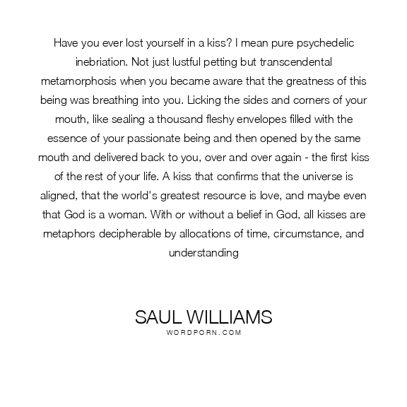 Have you ever lost yourself in a kiss? I mean pure psychedelic inebriation. Not just lustful petting but transcendental metamorphosis when you became aware that the greatness of this being was breathing into you. Licking the sides and corners of your mouth, like sealing a thousand fleshy envelopes filled with the essence of your passionate being and then opened by the same mouth and delivered back to you, over and over again - the first kiss of the rest of your life. A kiss that confirms that the universe is aligned, that the world's greatest resource is love, and maybe even that God is a woman. With or without a belief in God, all kisses are metaphors decipherable by allocations of time, circumstance, and understanding