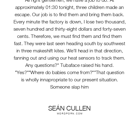 All right gentlemen, we have a job to do. At approximately 01:30 tonight, three children made an escape. Our job is to find them and bring them back. Every minute the factory is down, I lose two thousand, seven hundred and thirty-eight dollars and forty-seven cents. Therefore, we must find them and find them fast. They were last seen heading south by southwest in three makeshift kites. We'll head in that direction, fanning out and using our heat sensors to track them. Any questions?" Tubaface raised his hand. "Yes?""Where do babies come from?""That question is wholly innapropriate to our present situation. Someone slap him