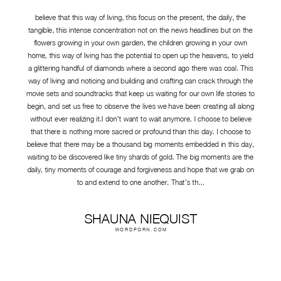 believe that this way of living, this focus on the present, the daily, the tangible, this intense concentration not on the news headlines but on the flowers growing in your own garden, the children growing in your own home, this way of living has the potential to open up the heavens, to yield a glittering handful of diamonds where a second ago there was coal. This way of living and noticing and building and crafting can crack through the movie sets and soundtracks that keep us waiting for our own life stories to begin, and set us free to observe the lives we have been creating all along without ever realizing it.I don’t want to wait anymore. I choose to believe that there is nothing more sacred or profound than this day. I choose to believe that there may be a thousand big moments embedded in this day, waiting to be discovered like tiny shards of gold. The big moments are the daily, tiny moments of courage and forgiveness and hope that we grab on to and extend to one another. That’s the drama of life, swirling all around us, and generally I don’t even see it, because I’m too busy waiting to become whatever it is I think I am about to become. The big moments are in every hour, every conversation, every meal, every meeting.The Heisman Trophy winner knows this. He knows that his big moment was not when they gave him the trophy. It was the thousand times he went to practice instead of going back to bed. It was the miles run on rainy days, the healthy meals when a burger sounded like heaven. That big moment represented and rested on a foundation of moments that had come before it.I believe that if we cultivate a true attention, a deep ability to see what has been there all along, we will find worlds within us and between us, dreams and stories and memories spilling over. The nuances and shades and secrets and intimations of love and friendship and marriage an parenting are action-packed and multicolored, if you know where to look.Today is your big moment. Moments, really. The life you’ve been waiting for is happening all around you. The scene unfolding right outside your window is worth more than the most beautiful painting, and the crackers and peanut butter that you’re having for lunch on the coffee table are as profound, in their own way, as the Last Supper. This is it. This is life in all its glory, swirling and unfolding around us, disguised as pedantic, pedestrian non-events. But pull of the mask and you will find your life, waiting to be made, chosen, woven, crafted.Your life, right now, today, is exploding with energy and power and detail and dimension, better than the best movie you have ever seen. You and your family and your friends and your house and your dinner table and your garage have all the makings of a life of epic proportions, a story for the ages. Because they all are. Every life is.You have stories worth telling, memories worth remembering, dreams worth working toward, a body worth feeding, a soul worth tending, and beyond that, the God of the universe dwells within you, the true culmination of super and natural. You are more than dust and bones.You are spirit and power and image of God.And you have been given Today