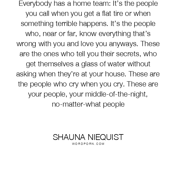 Everybody has a home team: It’s the people you call when you get a flat tire or when something terrible happens. It’s the people who, near or far, know everything that’s wrong with you and love you anyways. These are the ones who tell you their secrets, who get themselves a glass of water without asking when they’re at your house. These are the people who cry when you cry. These are your people, your middle-of-the-night, no-matter-what people