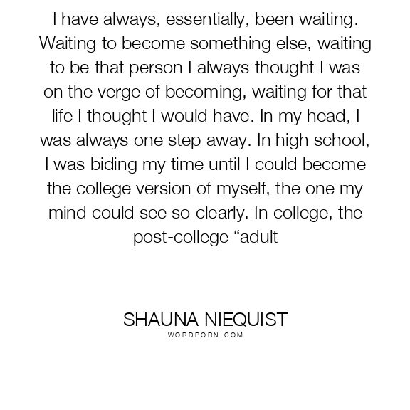 I have always, essentially, been waiting. Waiting to become something else, waiting to be that person I always thought I was on the verge of becoming, waiting for that life I thought I would have. In my head, I was always one step away. In high school, I was biding my time until I could become the college version of myself, the one my mind could see so clearly. In college, the post-college “adult