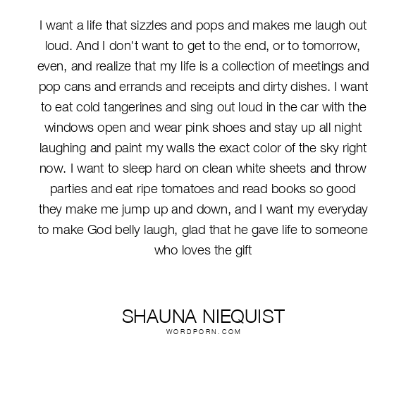 I want a life that sizzles and pops and makes me laugh out loud. And I don't want to get to the end, or to tomorrow, even, and realize that my life is a collection of meetings and pop cans and errands and receipts and dirty dishes. I want to eat cold tangerines and sing out loud in the car with the windows open and wear pink shoes and stay up all night laughing and paint my walls the exact color of the sky right now. I want to sleep hard on clean white sheets and throw parties and eat ripe tomatoes and read books so good they make me jump up and down, and I want my everyday to make God belly laugh, glad that he gave life to someone who loves the gift