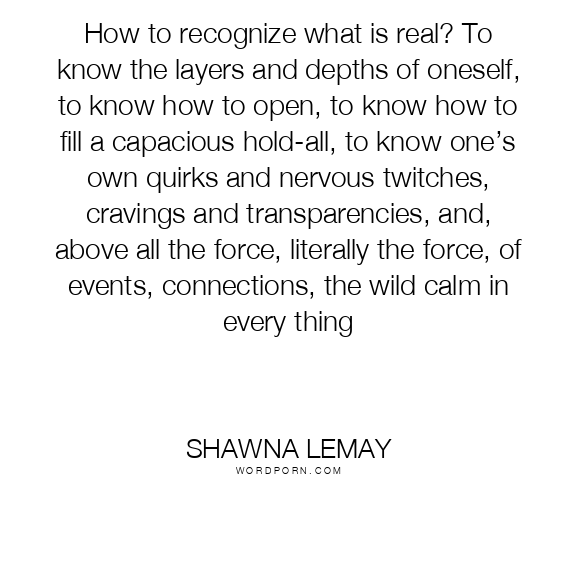 How to recognize what is real? To know the layers and depths of oneself, to know how to open, to know how to fill a capacious hold-all, to know one’s own quirks and nervous twitches, cravings and transparencies, and, above all the force, literally the force, of events, connections, the wild calm in every thing