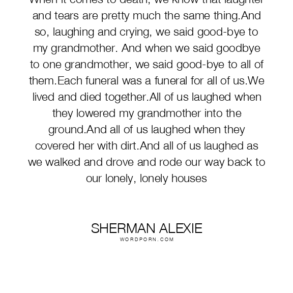 When it comes to death, we know that laughter and tears are pretty much the same thing.And so, laughing and crying, we said good-bye to my grandmother. And when we said goodbye to one grandmother, we said good-bye to all of them.Each funeral was a funeral for all of us.We lived and died together.All of us laughed when they lowered my grandmother into the ground.And all of us laughed when they covered her with dirt.And all of us laughed as we walked and drove and rode our way back to our lonely, lonely houses