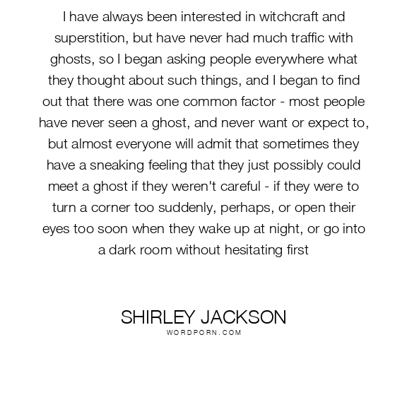 I have always been interested in witchcraft and superstition, but have never had much traffic with ghosts, so I began asking people everywhere what they thought about such things, and I began to find out that there was one common factor - most people have never seen a ghost, and never want or expect to, but almost everyone will admit that sometimes they have a sneaking feeling that they just possibly could meet a ghost if they weren't careful - if they were to turn a corner too suddenly, perhaps, or open their eyes too soon when they wake up at night, or go into a dark room without hesitating first