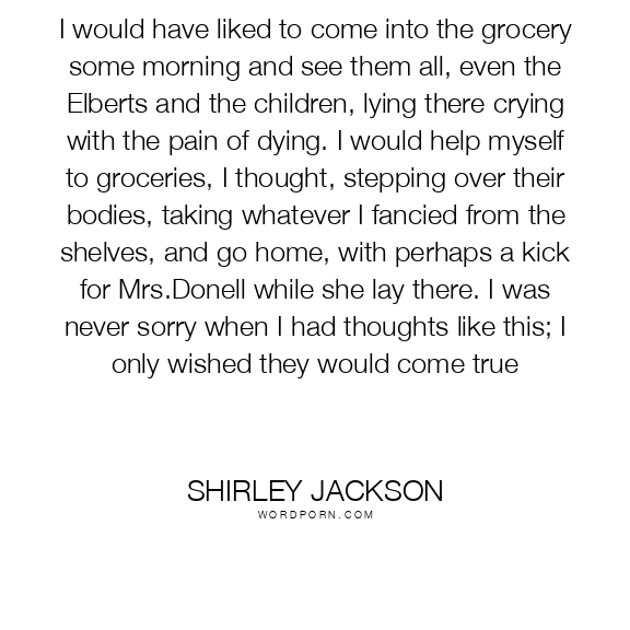 I would have liked to come into the grocery some morning and see them all, even the Elberts and the children, lying there crying with the pain of dying. I would help myself to groceries, I thought, stepping over their bodies, taking whatever I fancied from the shelves, and go home, with perhaps a kick for Mrs.Donell while she lay there. I was never sorry when I had thoughts like this; I only wished they would come true