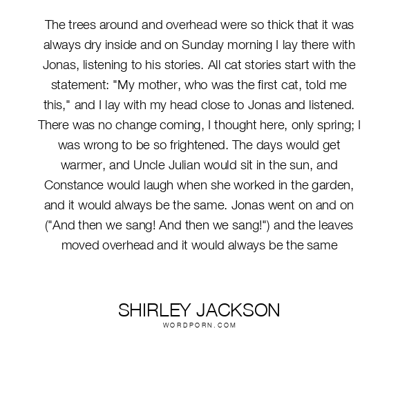 The trees around and overhead were so thick that it was always dry inside and on Sunday morning I lay there with Jonas, listening to his stories. All cat stories start with the statement: "My mother, who was the first cat, told me this," and I lay with my head close to Jonas and listened. There was no change coming, I thought here, only spring; I was wrong to be so frightened. The days would get warmer, and Uncle Julian would sit in the sun, and Constance would laugh when she worked in the garden, and it would always be the same. Jonas went on and on ("And then we sang! And then we sang!") and the leaves moved overhead and it would always be the same