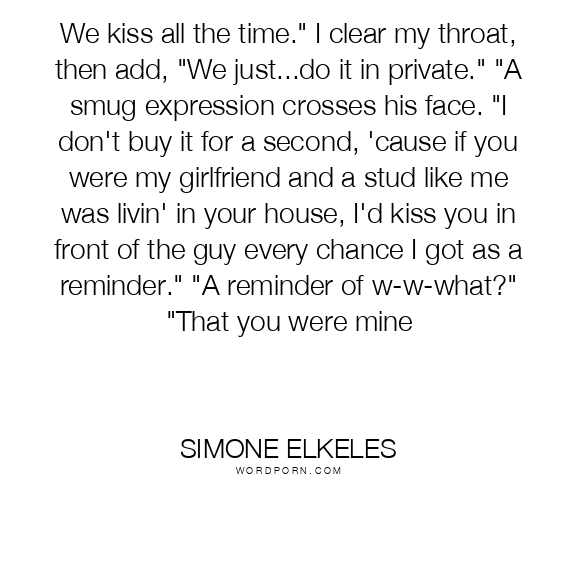 We kiss all the time." I clear my throat, then add, "We just...do it in private." "A smug expression crosses his face. "I don't buy it for a second, 'cause if you were my girlfriend and a stud like me was livin' in your house, I'd kiss you in front of the guy every chance I got as a reminder." "A reminder of w-w-what?" "That you were mine
