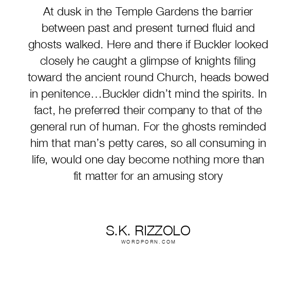 At dusk in the Temple Gardens the barrier between past and present turned fluid and ghosts walked. Here and there if Buckler looked closely he caught a glimpse of knights filing toward the ancient round Church, heads bowed in penitence…Buckler didn’t mind the spirits. In fact, he preferred their company to that of the general run of human. For the ghosts reminded him that man’s petty cares, so all consuming in life, would one day become nothing more than fit matter for an amusing story