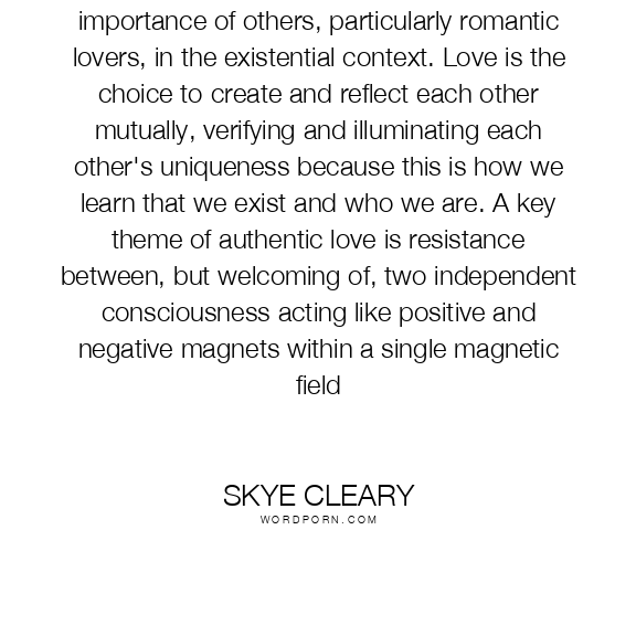 Peter Koestenbaum also elaborated on the importance of others, particularly romantic lovers, in the existential context. Love is the choice to create and reflect each other mutually, verifying and illuminating each other's uniqueness because this is how we learn that we exist and who we are. A key theme of authentic love is resistance between, but welcoming of, two independent consciousness acting like positive and negative magnets within a single magnetic field
