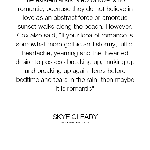 The existentialists' view of love is not romantic, because they do not believe in love as an abstract force or amorous sunset walks along the beach. However, Cox also said, "if your idea of romance is somewhat more gothic and stormy, full of heartache, yearning and the thwarted desire to possess breaking up, making up and breaking up again, tears before bedtime and tears in the rain, then maybe it is romantic"
