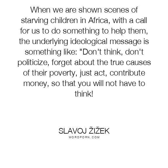 When we are shown scenes of starving children in Africa, with a call for us to do something to help them, the underlying ideological message is something like: "Don't think, don't politicize, forget about the true causes of their poverty, just act, contribute money, so that you will not have to think!