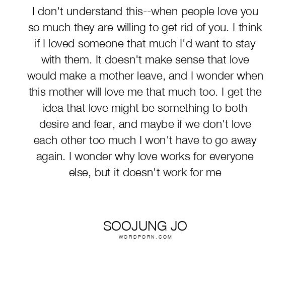 I don't understand this--when people love you so much they are willing to get rid of you. I think if I loved someone that much I'd want to stay with them. It doesn't make sense that love would make a mother leave, and I wonder when this mother will love me that much too. I get the idea that love might be something to both desire and fear, and maybe if we don't love each other too much I won't have to go away again. I wonder why love works for everyone else, but it doesn't work for me