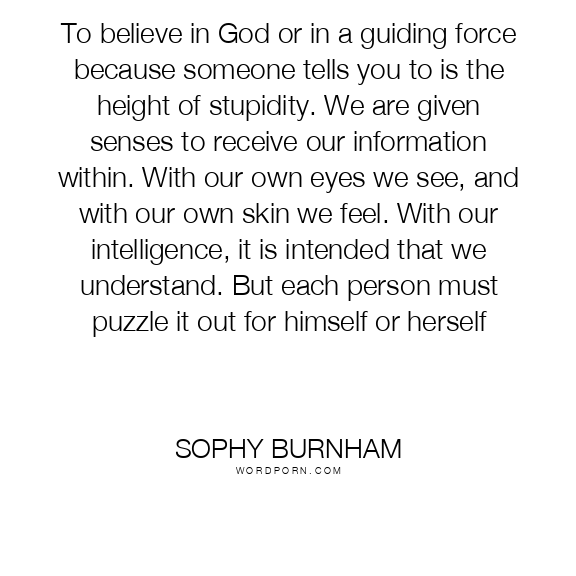 To believe in God or in a guiding force because someone tells you to is the height of stupidity. We are given senses to receive our information within. With our own eyes we see, and with our own skin we feel. With our intelligence, it is intended that we understand. But each person must puzzle it out for himself or herself
