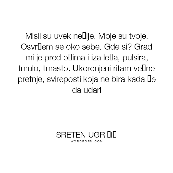 Misli su uvek nečije. Moje su tvoje. Osvrćem se oko sebe. Gde si? Grad mi je pred očima i iza leđa, pulsira, tmulo, tmasto. Ukorenjeni ritam večne pretnje, svireposti koja ne bira kada će da udari