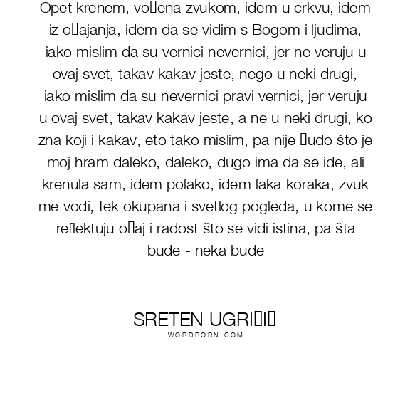 Opet krenem, vođena zvukom, idem u crkvu, idem iz očajanja, idem da se vidim s Bogom i ljudima, iako mislim da su vernici nevernici, jer ne veruju u ovaj svet, takav kakav jeste, nego u neki drugi, iako mislim da su nevernici pravi vernici, jer veruju u ovaj svet, takav kakav jeste, a ne u neki drugi, ko zna koji i kakav, eto tako mislim, pa nije čudo što je moj hram daleko, daleko, dugo ima da se ide, ali krenula sam, idem polako, idem laka koraka, zvuk me vodi, tek okupana i svetlog pogleda, u kome se reflektuju očaj i radost što se vidi istina, pa šta bude - neka bude