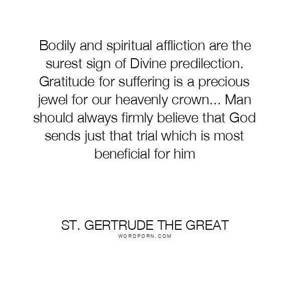 Bodily and spiritual affliction are the surest sign of Divine predilection. Gratitude for suffering is a precious jewel for our heavenly crown... Man should always firmly believe that God sends just that trial which is most beneficial for him