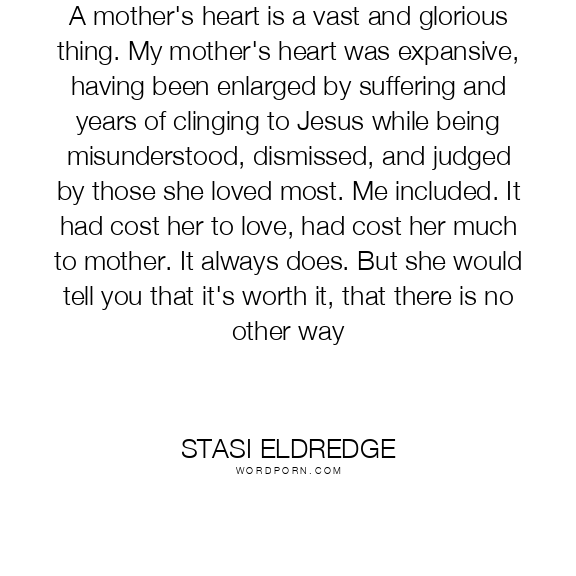 Stasi Eldredge quote. A mother's heart is a vast and glorious thing. My mother's heart was expansive, having been enlarged by suffering and years of clinging to Jesus while being misunderstood, dismissed, and judged by those she loved most. Me included. It had cost her to love, had cost her much to mother. It always does. But she would tell you that it's worth it, that there is no other way