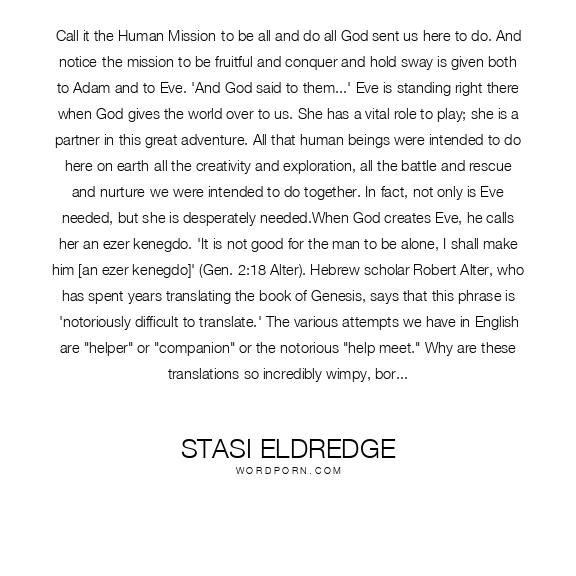 Stasi Eldredge quote. Call it the Human Mission-to be all and do all God sent us here to do. And notice-the mission to be fruitful and conquer and hold sway is given both to Adam and to Eve. 'And God said to them...' Eve is standing right there when God gives the world over to us. She has a vital role to play; she is a partner in this great adventure. All that human beings were intended to do here on earth-all the creativity and exploration, all the battle and rescue and nurture-we were intended to do together. In fact, not only is Eve needed, but she is desperately needed.When God creates Eve, he calls her an ezer kenegdo. 'It is not good for the man to be alone, I shall make him [an ezer kenegdo]' (Gen. 2:18 Alter). Hebrew scholar Robert Alter, who has spent years translating the book of Genesis, says that this phrase is 'notoriously difficult to translate.' The various attempts we have in English are