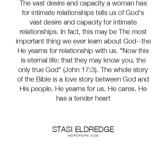 Stasi Eldredge quote. The vast desire and capacity a woman has for intimate relationships tells us of God's vast desire and capacity for intimate relationships. In fact, this may be The most important thing we ever learn about God--the He yearns for relationship with us.