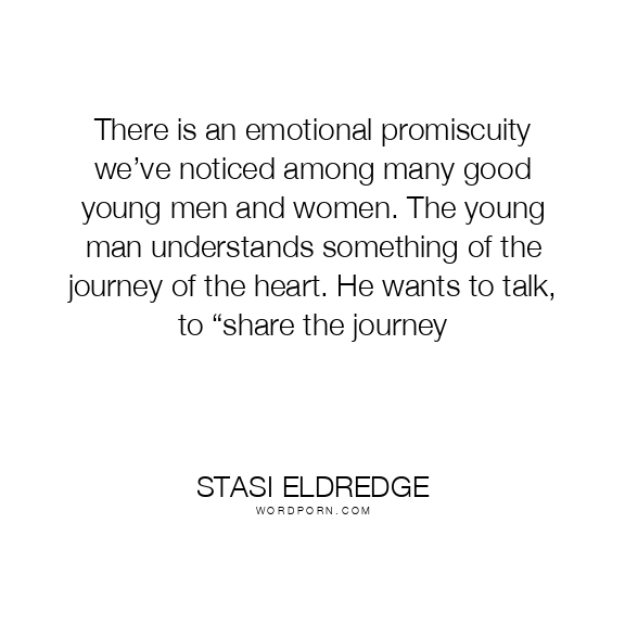 Stasi Eldredge quote. There is an emotional promiscuity we’ve noticed among many good young men and women. The young man understands something of the journey of the heart. He wants to talk, to “share the journey