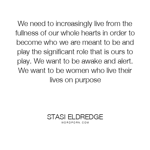 Stasi Eldredge quote. We need to increasingly live from the fullness of our whole hearts in order to become who we are meant to be and play the significant role that is ours to play. We want to be awake and alert. We want to be women who live their lives on purpose