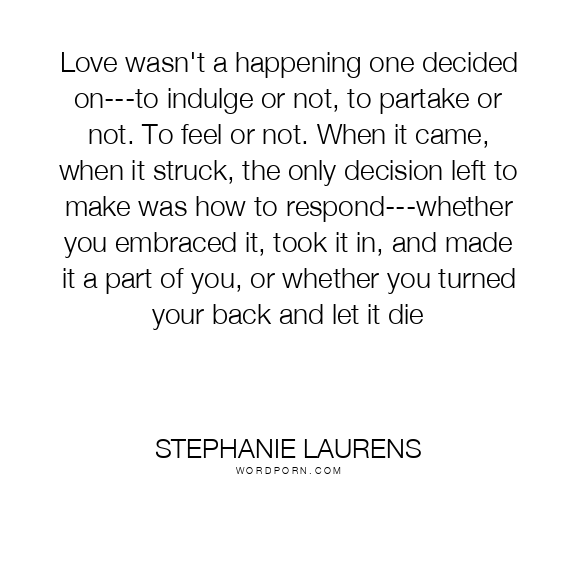Love wasn't a happening one decided on---to indulge or not, to partake or not. To feel or not. When it came, when it struck, the only decision left to make was how to respond---whether you embraced it, took it in, and made it a part of you, or whether you turned your back and let it die