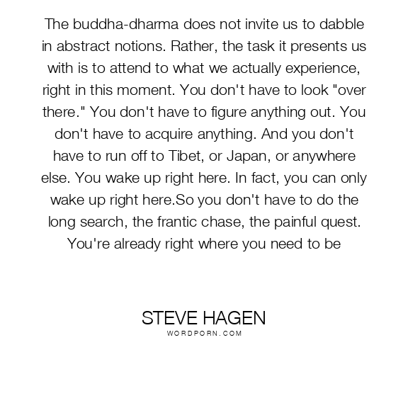 The buddha-dharma does not invite us to dabble in abstract notions. Rather, the task it presents us with is to attend to what we actually experience, right in this moment. You don't have to look "over there." You don't have to figure anything out. You don't have to acquire anything. And you don't have to run off to Tibet, or Japan, or anywhere else. You wake up right here. In fact, you can only wake up right here.So you don't have to do the long search, the frantic chase, the painful quest. You're already right where you need to be