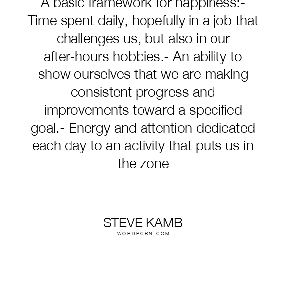 A basic framework for happiness:- Time spent daily, hopefully in a job that challenges us, but also in our after-hours hobbies.- An ability to show ourselves that we are making consistent progress and improvements toward a specified goal.- Energy and attention dedicated each day to an activity that puts us in the zone