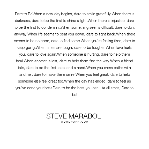 Dare to BeWhen a new day begins, dare to smile gratefully.When there is darkness, dare to be the first to shine a light.When there is injustice, dare to be the first to condemn it.When something seems difficult, dare to do it anyway.When life seems to beat you down, dare to fight back.When there seems to be no hope, dare to find some.When you’re feeling tired, dare to keep going.When times are tough, dare to be tougher.When love hurts you, dare to love again.When someone is hurting, dare to help them heal.When another is lost, dare to help them find the way.When a friend falls, dare to be the first to extend a hand.When you cross paths with another, dare to make them smile.When you feel great, dare to help someone else feel great too.When the day has ended, dare to feel as you’ve done your best.Dare to be the best you can –At all times, Dare to be!