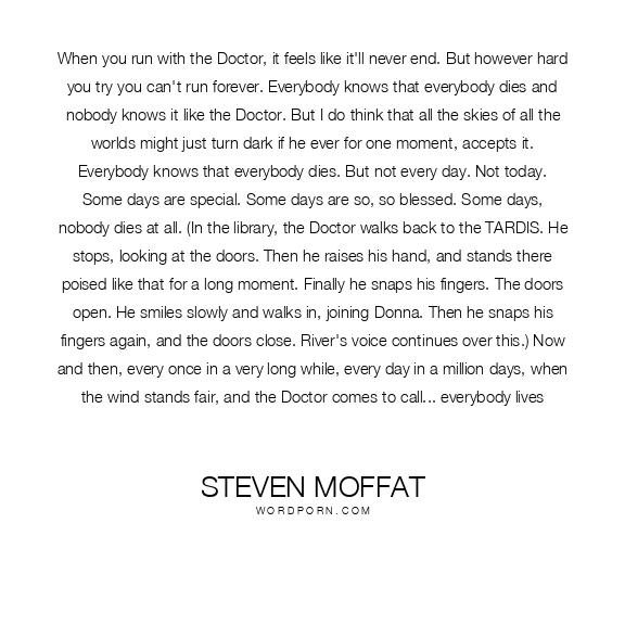 When you run with the Doctor, it feels like it'll never end. But however hard you try you can't run forever. Everybody knows that everybody dies and nobody knows it like the Doctor. But I do think that all the skies of all the worlds might just turn dark if he ever for one moment, accepts it. Everybody knows that everybody dies. But not every day. Not today. Some days are special. Some days are so, so blessed. Some days, nobody dies at all. (In the library, the Doctor walks back to the TARDIS. He stops, looking at the doors. Then he raises his hand, and stands there poised like that for a long moment. Finally he snaps his fingers. The doors open. He smiles slowly and walks in, joining Donna. Then he snaps his fingers again, and the doors close. River's voice continues over this.) Now and then, every once in a very long while, every day in a million days, when the wind stands fair, and the Doctor comes to call... everybody lives