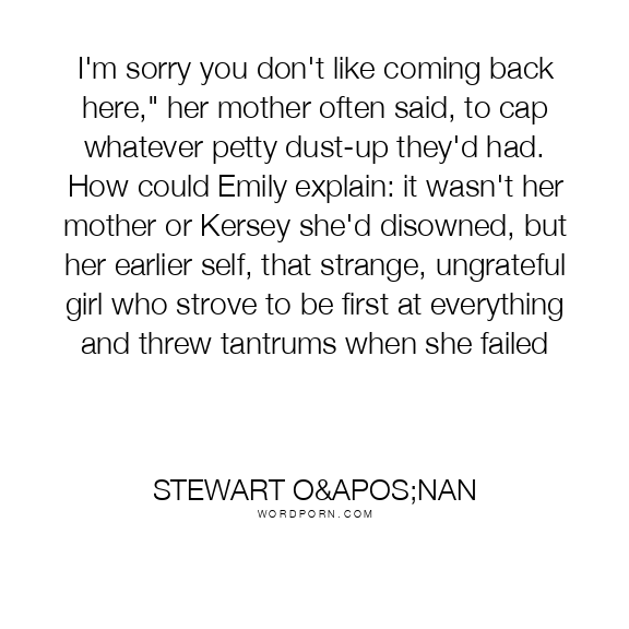 I'm sorry you don't like coming back here," her mother often said, to cap whatever petty dust-up they'd had. How could Emily explain: it wasn't her mother or Kersey she'd disowned, but her earlier self, that strange, ungrateful girl who strove to be first at everything and threw tantrums when she failed