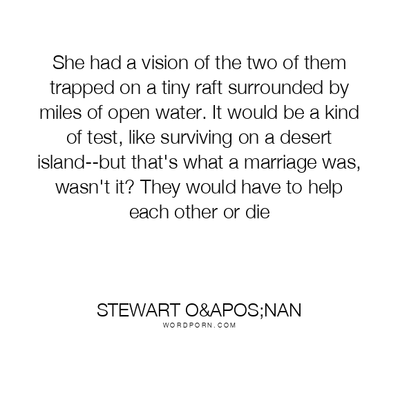 Stewart O'Nan quote. She had a vision of the two of them trapped on a tiny raft surrounded by miles of open water. It would be a kind of test, like surviving on a desert island--but that's what a marriage was, wasn't it? They would have to help each other or die