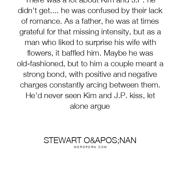 Stewart O'Nan quote. There was a lot about Kim and J.P. he didn't get.... he was confused by their lack of romance. As a father, he was at times grateful for that missing intensity, but as a man who liked to surprise his wife with flowers, it baffled him. Maybe he was old-fashioned, but to him a couple meant a strong bond, with positive and negative charges constantly arcing between them. He'd never seen Kim and J.P. kiss, let alone argue