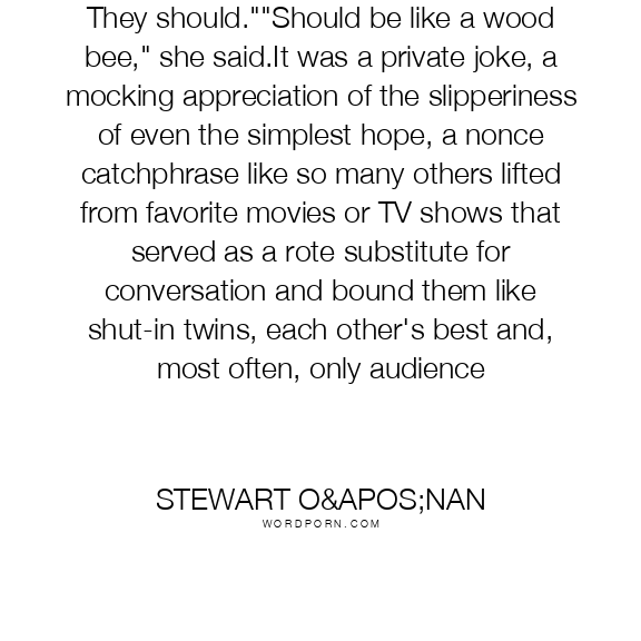 They should.""Should be like a wood bee," she said.It was a private joke, a mocking appreciation of the slipperiness of even the simplest hope, a nonce catchphrase like so many others lifted from favorite movies or TV shows that served as a rote substitute for conversation and bound them like shut-in twins, each other's best and, most often, only audience