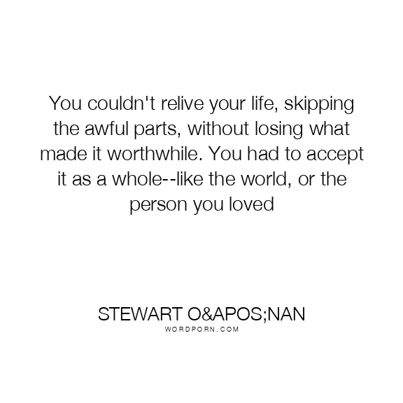 Stewart O'Nan quote. You couldn't relive your life, skipping the awful parts, without losing what made it worthwhile. You had to accept it as a whole--like the world, or the person you loved