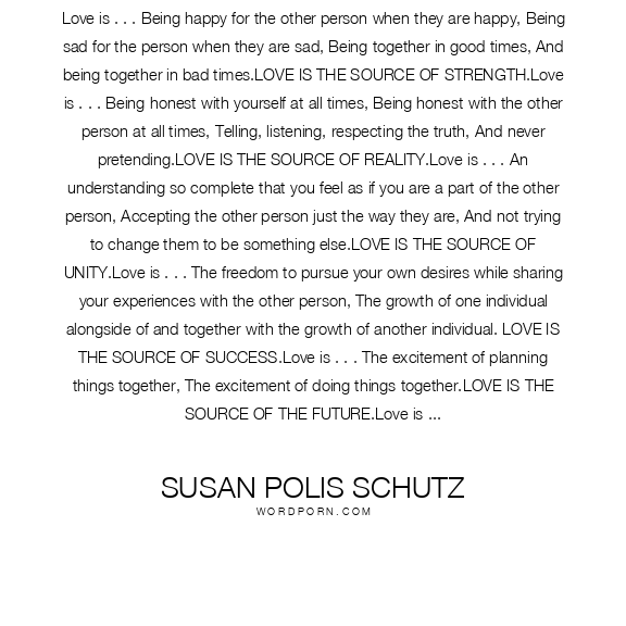 Love is . . . Being happy for the other person when they are happy, Being sad for the person when they are sad, Being together in good times, And being together in bad times.LOVE IS THE SOURCE OF STRENGTH.Love is . . . Being honest with yourself at all times, Being honest with the other person at all times, Telling, listening, respecting the truth, And never pretending.LOVE IS THE SOURCE OF REALITY.Love is . . . An understanding so complete that you feel as if you are a part of the other person, Accepting the other person just the way they are, And not trying to change them to be something else.LOVE IS THE SOURCE OF UNITY.Love is . . . The freedom to pursue your own desires while sharing your experiences with the other person, The growth of one individual alongside of and together with the growth of another individual. LOVE IS THE SOURCE OF SUCCESS.Love is . . . The excitement of planning things together, The excitement of doing things together.LOVE IS THE SOURCE OF THE FUTURE.Love is . . . The fury of the storm, The calm in the rainbow.LOVE IS THE SOURCE OF PASSION.Love is . . . Giving and taking in a daily situation, Being patient with each other's needs and desires.LOVE IS THE SOURCE OF SHARING.Love is . . . Knowing that the other person will always be with you regardless of what happens, Missing the other person when they are away but remaining near in heart at all times.LOVE IS THE SOURCE OF SECURITY.LOVE IS . . . THE SOURCE OF LIFE!