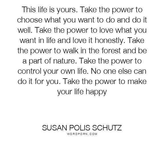 This life is yours. Take the power to choose what you want to do and do it well. Take the power to love what you want in life and love it honestly. Take the power to walk in the forest and be a part of nature. Take the power to control your own life. No one else can do it for you. Take the power to make your life happy