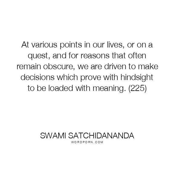 At various points in our lives, or on a quest, and for reasons that often remain obscure, we are driven to make decisions which prove with hindsight to be loaded with meaning. (225)