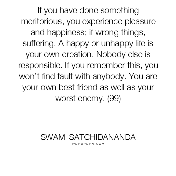 If you have done something meritorious, you experience pleasure and happiness; if wrong things, suffering. A happy or unhappy life is your own creation. Nobody else is responsible. If you remember this, you won’t find fault with anybody. You are your own best friend as well as your worst enemy. (99)