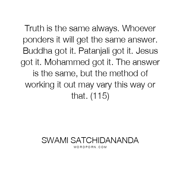 Truth is the same always. Whoever ponders it will get the same answer. Buddha got it. Patanjali got it. Jesus got it. Mohammed got it. The answer is the same, but the method of working it out may vary this way or that. (115)