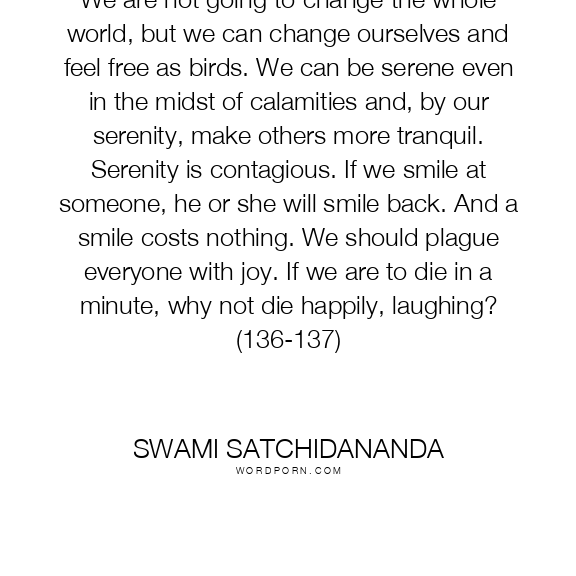 We are not going to change the whole world, but we can change ourselves and feel free as birds. We can be serene even in the midst of calamities and, by our serenity, make others more tranquil. Serenity is contagious. If we smile at someone, he or she will smile back. And a smile costs nothing. We should plague everyone with joy. If we are to die in a minute, why not die happily, laughing? (136-137)