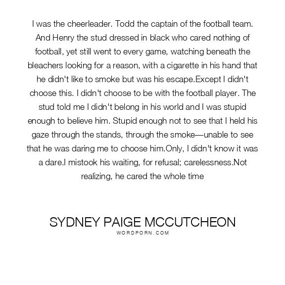 I was the cheerleader. Todd the captain of the football team. And Henry the stud dressed in black who cared nothing of football, yet still went to every game, watching beneath the bleachers looking for a reason, with a cigarette in his hand that he didn't like to smoke but was his escape.Except I didn't choose this. I didn't choose to be with the football player. The stud told me I didn't belong in his world and I was stupid enough to believe him. Stupid enough not to see that I held his gaze through the stands, through the smoke—unable to see that he was daring me to choose him.Only, I didn't know it was a dare.I mistook his waiting, for refusal; carelessness.Not realizing, he cared the whole time