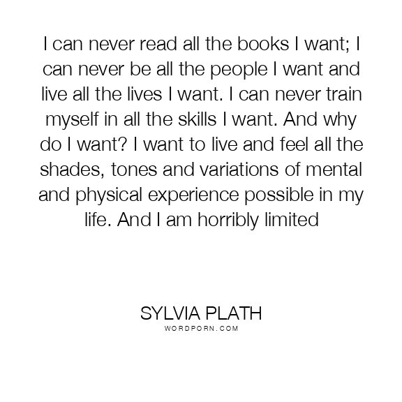I can never read all the books I want; I can never be all the people I want and live all the lives I want. I can never train myself in all the skills I want. And why do I want? I want to live and feel all the shades, tones and variations of mental and physical experience possible in my life. And I am horribly limited