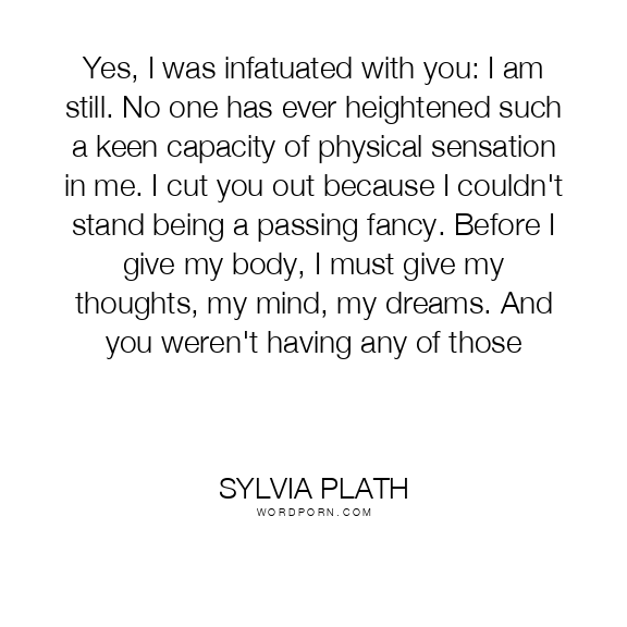 Yes, I was infatuated with you: I am still. No one has ever heightened such a keen capacity of physical sensation in me. I cut you out because I couldn't stand being a passing fancy. Before I give my body, I must give my thoughts, my mind, my dreams. And you weren't having any of those