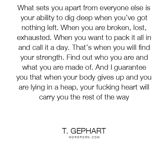 What sets you apart from everyone else is your ability to dig deep when you’ve got nothing left. When you are broken, lost, exhausted. When you want to pack it all in and call it a day. That’s when you will find your strength. Find out who you are and what you are made of. And I guarantee you that when your body gives up and you are lying in a heap, your fucking heart will carry you the rest of the way