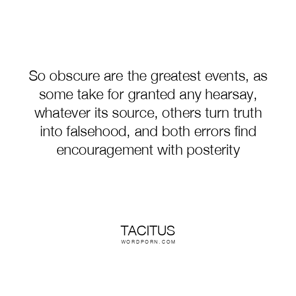 So obscure are the greatest events, as some take for granted any hearsay, whatever its source, others turn truth into falsehood, and both errors find encouragement with posterity