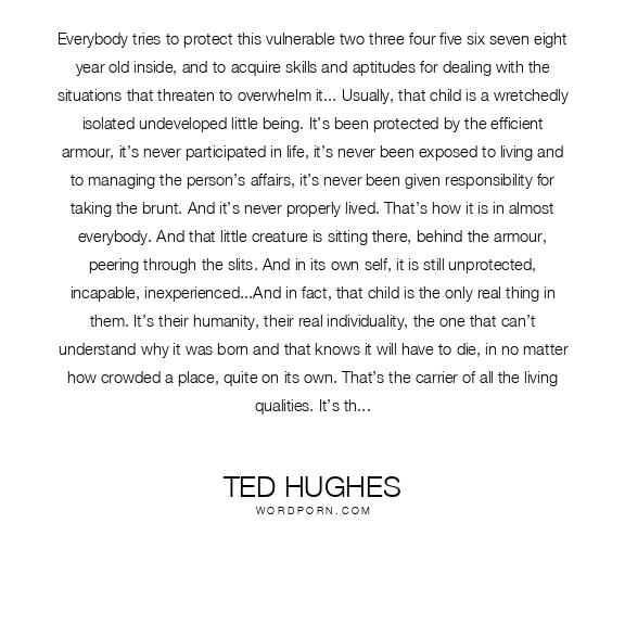 Ted Hughes quote. Everybody tries to protect this vulnerable two three four five six seven eight year old inside, and to acquire skills and aptitudes for dealing with the situations that threaten to overwhelm it... Usually, that child is a wretchedly isolated undeveloped little being. It’s been protected by the efficient armour, it’s never participated in life, it’s never been exposed to living and to managing the person’s affairs, it’s never been given responsibility for taking the brunt. And it’s never properly lived. That’s how it is in almost everybody. And that little creature is sitting there, behind the armour, peering through the slits. And in its own self, it is still unprotected, incapable, inexperienced...And in fact, that child is the only real thing in them. It’s their humanity, their real individuality, the one that can’t understand why it was born and that knows it will have to die, in no matter how crowded a place, quite on its own. That’s the carrier of all the living qualities. It’s the centre of all the possible magic and revelation. What doesn’t come out of that creature isn’t worth having, or it’s worth having only as a tool—for that creature to use and turn to account and make meaningful...And so, wherever life takes it by surprise, and suddenly the artificial self of adaptations proves inadequate, and fails to ward off the invasion of raw experience, that inner self is thrown into the front line—unprepared, with all its childhood terrors round its ears.And yet that’s the moment it wants. That’s where it comes alive—even if only to be overwhelmed and bewildered and hurt. And that’s where it calls up its own resources—not artificial aids, picked up outside, but real inner resources, real biological ability to cope, and to turn to account, and to enjoy.That’s the paradox: the only time most people feel alive is when they’re suffering, when something overwhelms their ordinary, careful armour, and the naked child is flung out onto the world. That’s why the things that are worst to undergo are best to remember.But when that child gets buried away under their adaptive and protective shells—he becomes one of the walking dead, a monster. So when you realise you’ve gone a few weeks and haven’t felt that awful struggle of your childish self—struggling to lift itself out of its inadequacy and incompetence—you’ll know you’ve gone some weeks without meeting new challenge, and without growing, and that you’ve gone some weeks towards losing touch with yourself