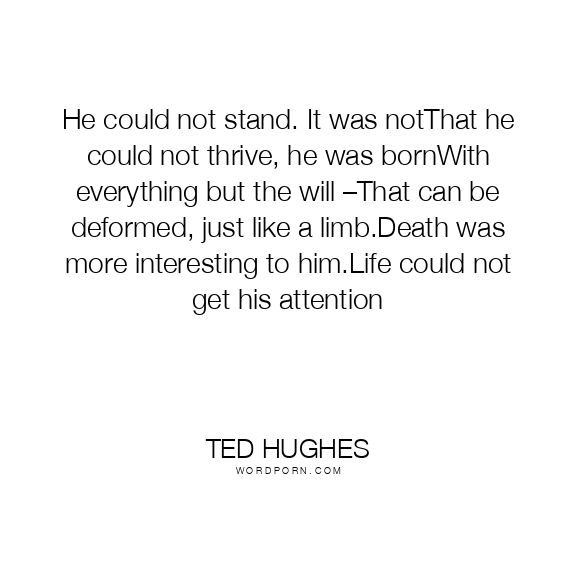 Ted Hughes quote. He could not stand. It was notThat he could not thrive, he was bornWith everything but the will –That can be deformed, just like a limb.Death was more interesting to him.Life could not get his attention