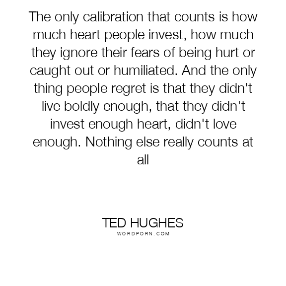 Ted Hughes quote. The only calibration that counts is how much heart people invest, how much they ignore their fears of being hurt or caught out or humiliated. And the only thing people regret is that they didn't live boldly enough, that they didn't invest enough heart, didn't love enough. Nothing else really counts at all